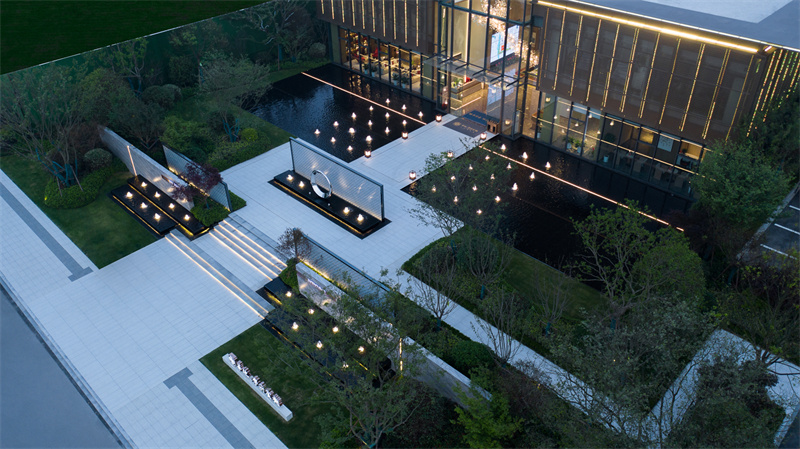 為致敬當地文化特色,以水做為環境的靈魂,一進迎賓,二進觀湖,三進尋瀑,將水揮灑到極致,在整個空間場景中呈現一場靈動的詩意美學。流水潺潺淙淙,仿佛輕奏歌謠,迎接每一位來賓的到訪,人與生活的嶄新通道,也借由這片水景,緩緩打開。