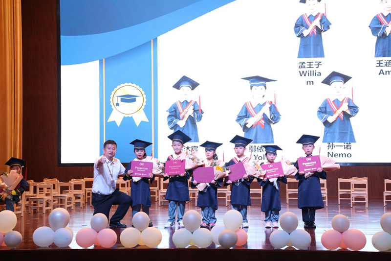 張寧校長、溫晨瑋校長和萬毅園長為大班的孩子們頒發畢業證書。