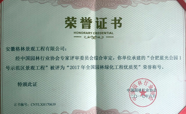 2017年6月18日,由中國(guó)園林行業(yè)協(xié)會(huì)主辦的2017中國(guó)園林綠化發(fā)展高層論壇在大連隆重開(kāi)幕。會(huì)上,我司承接的“藍(lán)光公園1號(hào)示范區(qū)景觀工程”被授予“2017年全國(guó)園林綠化工程優(yōu)質(zhì)獎(jiǎng)”。