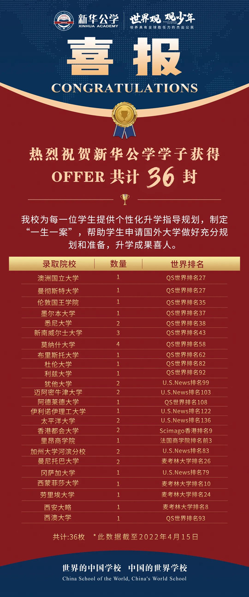 在競爭異常激烈的申請季里,新華學子表現不俗,收獲了豐碩的成果。2021-2022學年新華公學迎來首屆12年級畢業生,9名學生一共收獲36Offer,其中不乏世界TOP10名校。