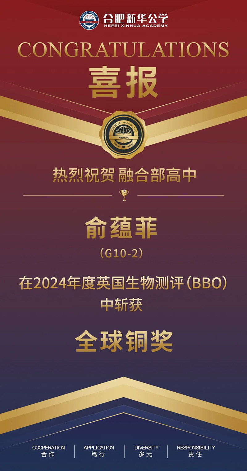 恭喜我校融合高中部G10-2的俞蘊菲同學(xué),在2024年度英國生物測評(BBO)中獲得全球銅獎的好成績。