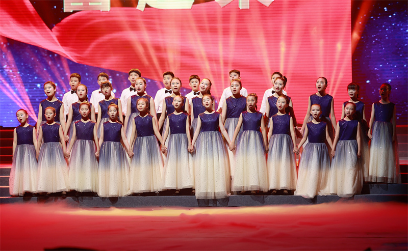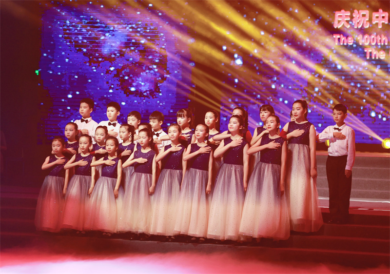 新華公學(xué)童聲合唱團完美的用哼鳴式演唱法為晚會三個篇章開場,用歌聲向中國共產(chǎn)黨百年華誕獻禮,用微笑和行動表明作為社會主義接班人的決心:“童心向黨,堅決跟黨走,聽從黨的指揮”。