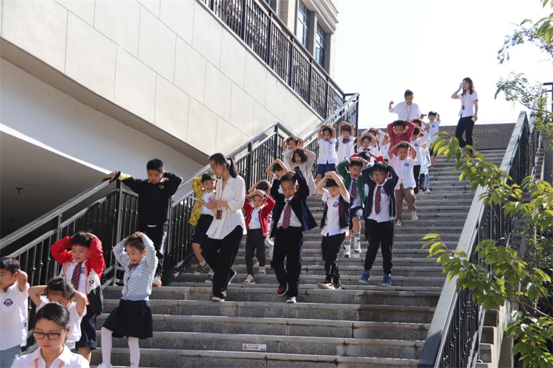 之后在凄厲的空襲警報(bào)聲中,大家立即抱頭蹲下或快速就近躲避,以防傷害。解除警報(bào)悠悠響起后,班級(jí)教師按照預(yù)定位置集中整隊(duì),清點(diǎn)學(xué)生人數(shù),匯報(bào)疏散情況,演練順利完成。