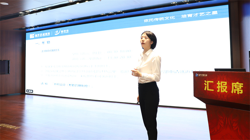 隨后,在激昂的樂曲和熱烈的掌聲中,主席臺領導走上舞臺共同開啟藝學堂教育教學質量月啟動儀式。啟動儀式后,藝學堂教學管理中心助理總監崔露璐做《教學管理制度培訓》,對藝學堂教師管理制度做了詳細的解讀,并對日常教學規范提出了更高的要求。