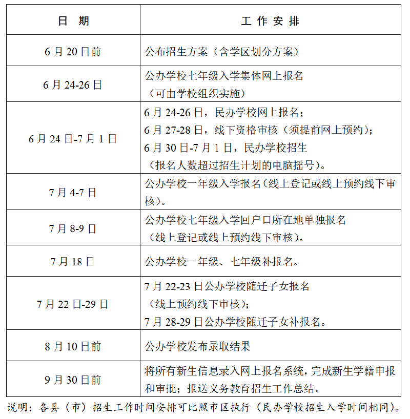 1. 招生時間。公辦學校招生時間從6月下旬開始,市區時間安排見下圖,具體時間由各縣(市)、區教育主管部門安排。
