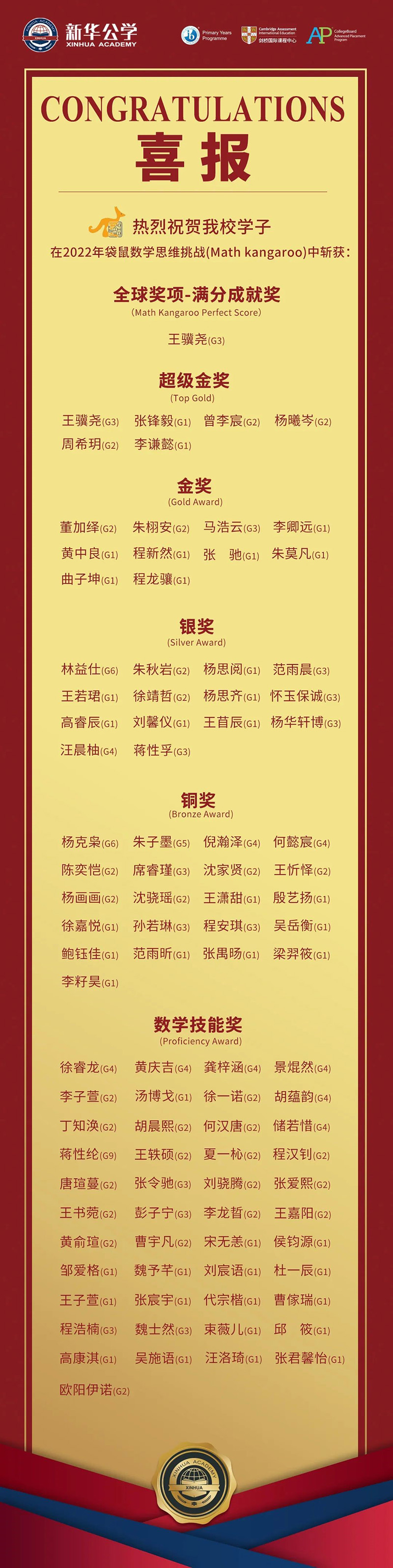 最后,再次祝賀所有獲獎同學與參賽同學!對數學的興趣只是起點,而在自己感興趣的領域深入鉆研、甚至選擇了高出自身年級的難度等級來挑戰自己,這樣的自信力與勇氣更為可貴!我們希望參賽的每一位新華學子,都能因這樣亮眼的成績而獲得成就感,在以后的學習中充滿動力、再創佳績!