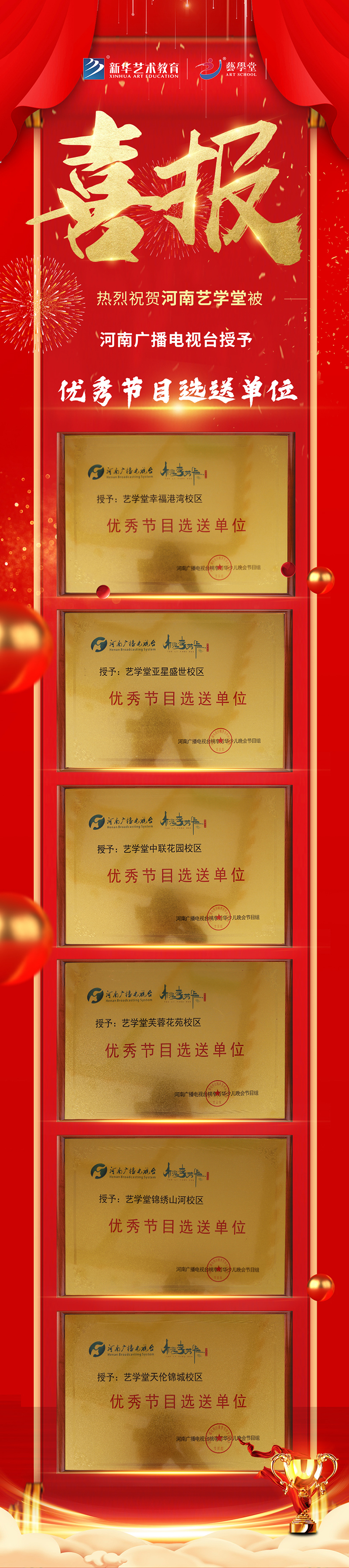 經過層層遴選,近日,鄭州藝學堂共9個節目登上河南廣播電視臺2022年少兒春晚。始于興趣,敬于藝術,活動現場學員們帶來精彩表演。其中,藝學堂幸福港灣校區、亞星盛世校區、中聯花園校區等6所校區喜獲優秀節目選送單位稱號。