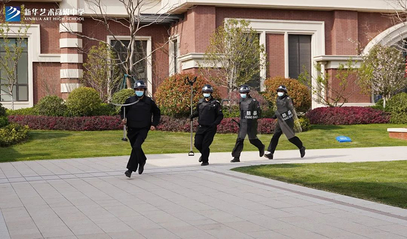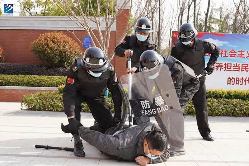 應急防暴組人員快速到達現場,手持警棍、鋼叉等迅速將施暴的“歹徒”團團圍住,成功將“歹徒”控制并帶離現場。確認現場安全后,廣播通知警報解除,學生恢復正常活動。