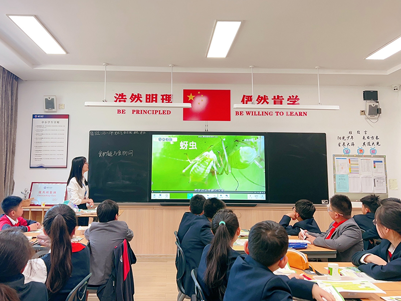武思佳老師帶來《食物鏈與食物網(wǎng)》。武老師以學(xué)生最喜歡的柯南導(dǎo)入課程,激勵(lì)學(xué)生一起來探案。引導(dǎo)學(xué)生觀察現(xiàn)場(chǎng)圖片,發(fā)現(xiàn)豆苗葉的不同。