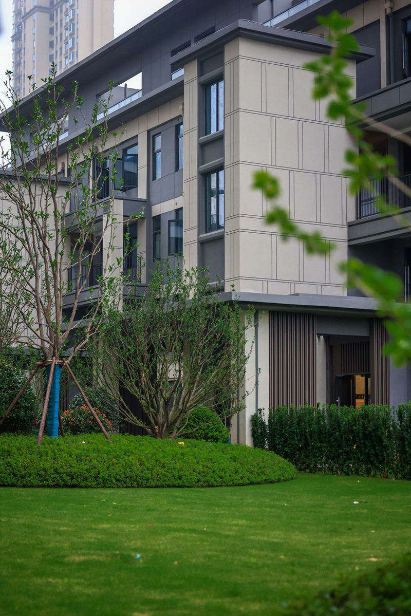 從方寸間的圖紙到漸露新姿的建筑,有序營(yíng)造出歷久彌新的時(shí)代美學(xué)。簡(jiǎn)約時(shí)尚的立面線條呈現(xiàn)建筑的挺拔感,于自然濃蔭中安靜掩映,盡顯清幽寧和。