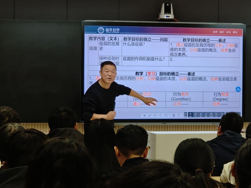 會議上,為提高校內學科教師學科素養,并根據雙語部高中近期的教育教學情況,雙語部中學尹漸平校長開展了一場“‘學教評’一體化教學設計”的專題講座。尹校長長期深入一線教學,講座內容深入淺出,運用詳實的課例,對如何實現“學教評”一體化教學設計進行了詳細的講解。專題講座分為“什么是學教評一致性教學設計”“教學設計要解決三個問題”“教學目標的確立和表述”“教學設計”“教學評價”“核心素養”六個部分