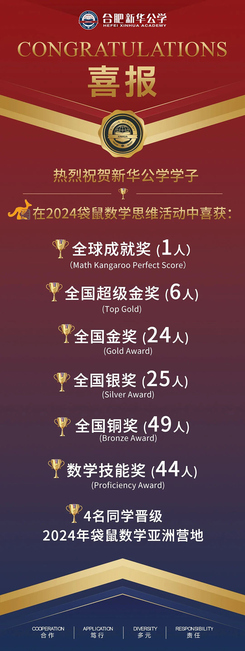 最后,再次祝賀所有獲獎同學與參賽同學!對數學的興趣只是起點,而在自己感興趣的領域深入鉆研、甚至選擇了高出自身年級的難度等級來挑戰自己,這樣的自信力與勇氣更為可貴!我們希望參賽的每一位新華學子,都能因這樣亮眼的成績而獲得成就感,在以后的學習中充滿動力、再創佳績!