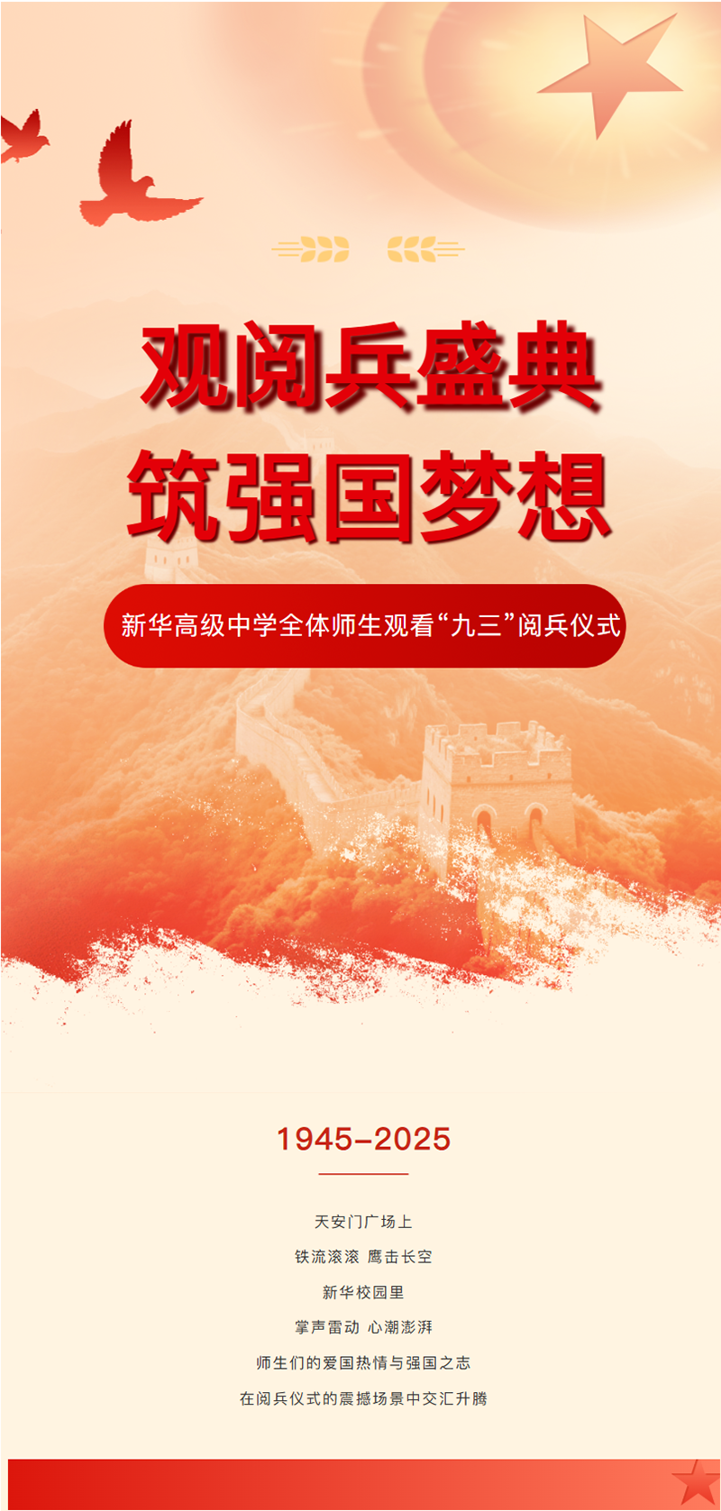2025年9月3日上午,紀念中國人民抗日戰爭暨世界反法西斯戰爭勝利80周年大會在北京天安門廣場隆重舉行。為銘記歷史、緬懷先烈、珍愛和平、開創未來,激發全體師生的愛國熱情和民族自豪感,新華高級中學精心組織全體師生齊聚在報告廳、教室共同觀看了此次大會直播,感受偉大祖國的強盛與輝煌。